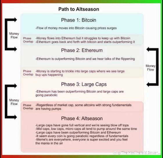 * Phase I: Bitcoin (BTC) Dominance: The cycle typically initiates with institutional and large-scale investor capital flowing into Bitcoin, the market's store of value. This phase is marked by a rising BTC price and an increase in Bitcoin Dominance ($BTC.D).