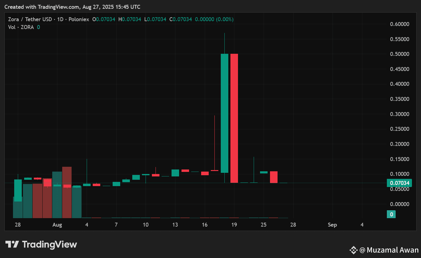 As of August 27, Zora is trading at around $0.092–$0.095, down roughly 43% from its peak but still up nearly 1,000% from its June low of $0.0078. Over the past 24 hours, the token has moved between –3% and +1% depending on the exchange, with a weekly loss of about 20%.