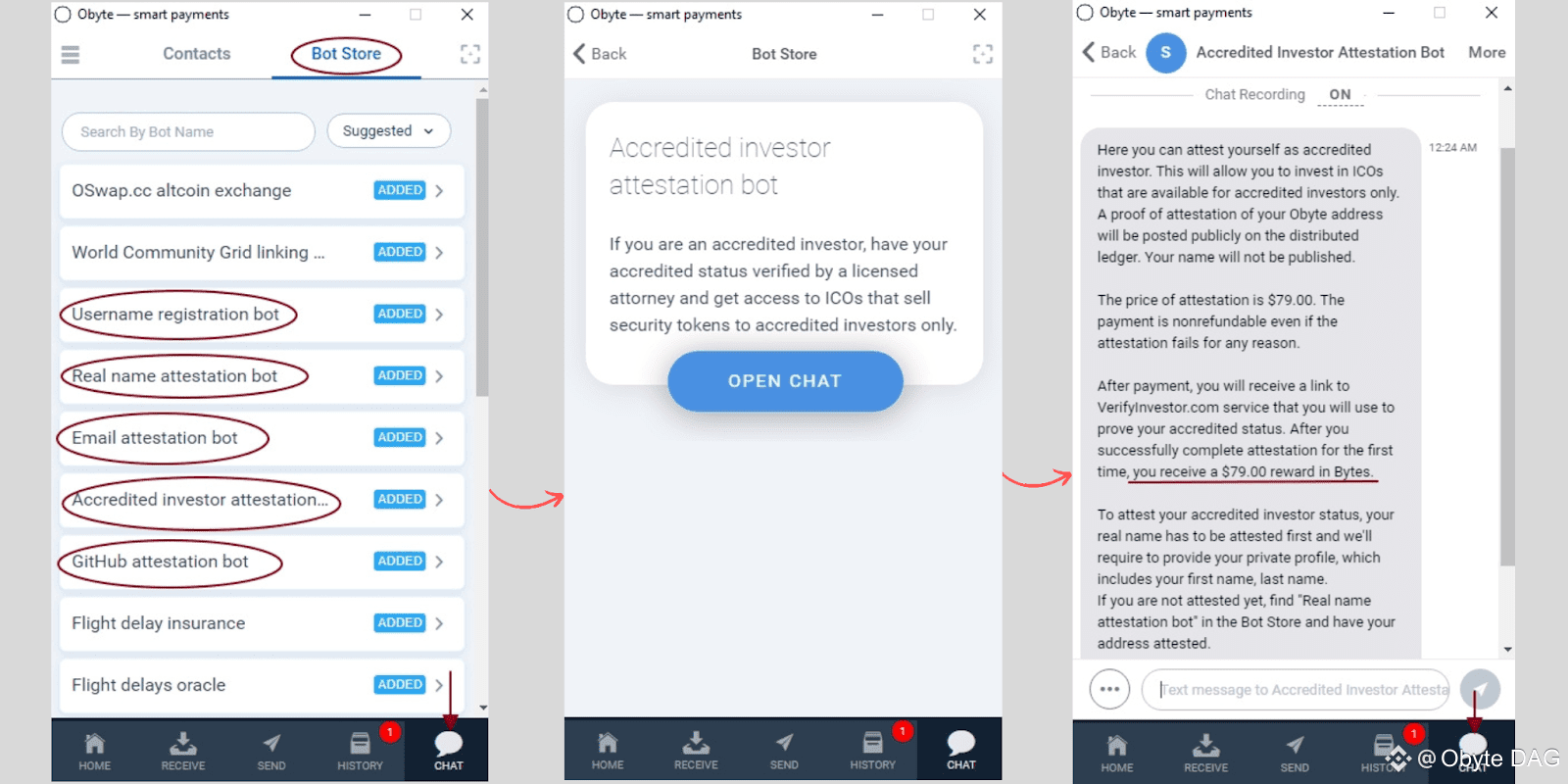 In the following years, other “bounty airdrop” programs were added to welcome more users, and some of them are still available. Currently, you can earn free GBYTEs in Obyte by verifying your personal information through attestations. This process allows you to confirm details like your real name, email, or GitHub account using chatbots in the Obyte wallet. Depending on the type of attestation you complete, you can earn between $8 and $79 in GBYTEs as a reward. These attestations also provide access to various applications within the Obyte ecosystem.