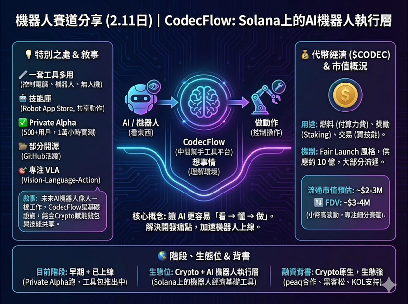 概念和敘事:現在做機器人或 AI 助手很麻煩,開發者每次都要自己接感測器、程式、雲端電腦,花好多時間和錢。CodecFlow 就像一個「中間幫手」,提供簡單工具,讓 AI 能直接看螢幕或相機、理解環境、然後控制機器人或電腦做事(比如點擊、移動手臂、自動操作 app)。敘事是:未來 AI 機器人會像人一樣工作(送東西、清潔、玩遊戲),而 CodecFlow 是幫它們「快速上線」的基礎平台,結合 crypto 讓機器人有錢包、能收錢、共享技能。