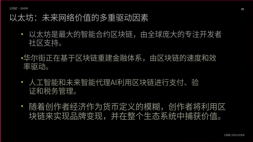 最大化国库收益:优化质押收益(有Tom DeMark等顾问提供alpha策略)、优化现金收益、进行增值性资本市场交易(未来可能包括并购)。BITM无债务,现金余额约6亿美元,已质押约三分之二的以太坊,年化奖励约2亿美元,完全质押后将达到3亿美元(每日约100万美元)。若以太坊达到1.2万美元,质押奖励将增至24亿美元。同时每股以太坊持有量较6月30日增长10倍。