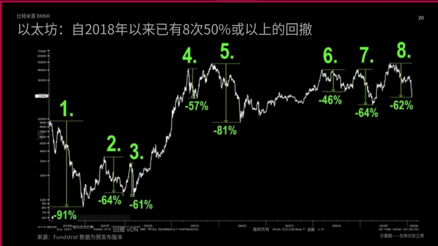 Tom Lee转向以太坊。他承认很多人对以太坊感到沮丧,但指出自2018年以来,以太坊已出现8次超过50%的跌幅,每次都以几乎相同的速度实现V形反弹,100%恢复。
