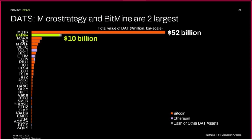演讲最重磅的部分是Tom Lee对“主导性加密资产持有实体”(演讲中多次提及“dominant DAs/debts”,结合上下文实际指类似MicroStrategy的公开上市公司通过国库持有加密资产的模式)的分析。