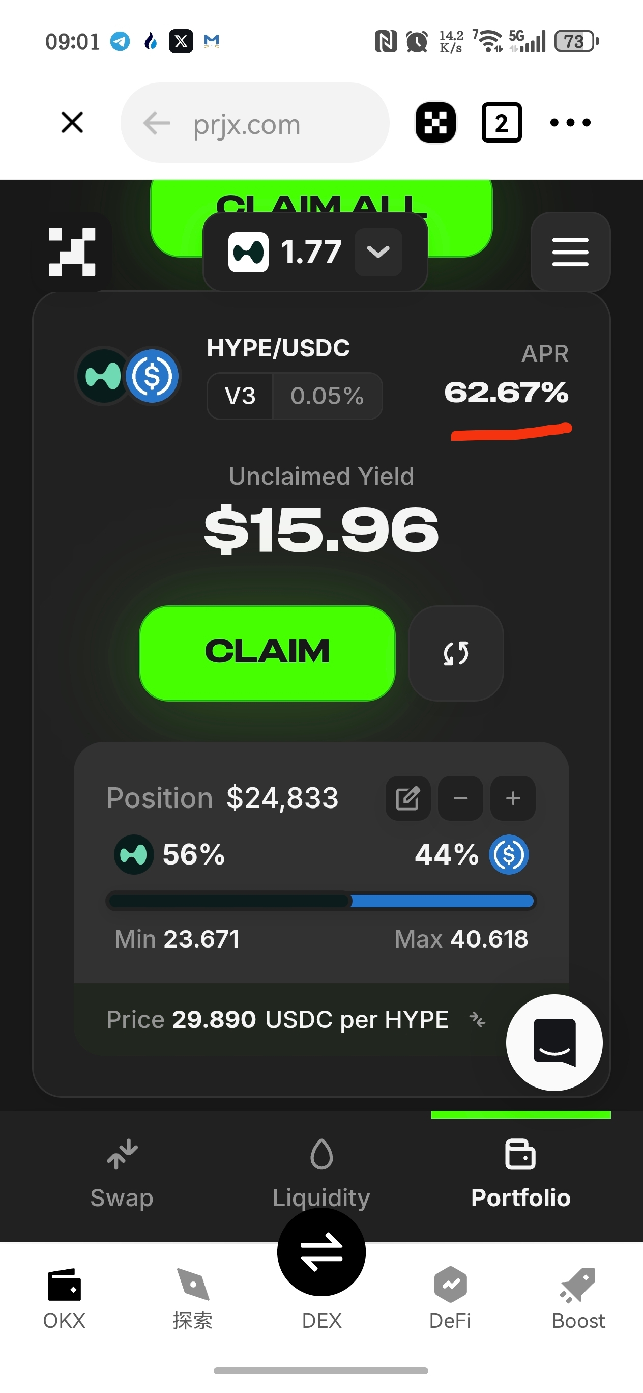 2月12日一天记录#hype 。我的流动性小金库(本金24851刀,hype价格变化。)像打了鸡血一样,以62%的年化收益率运转,预计今天能给我带来42刀的收益!