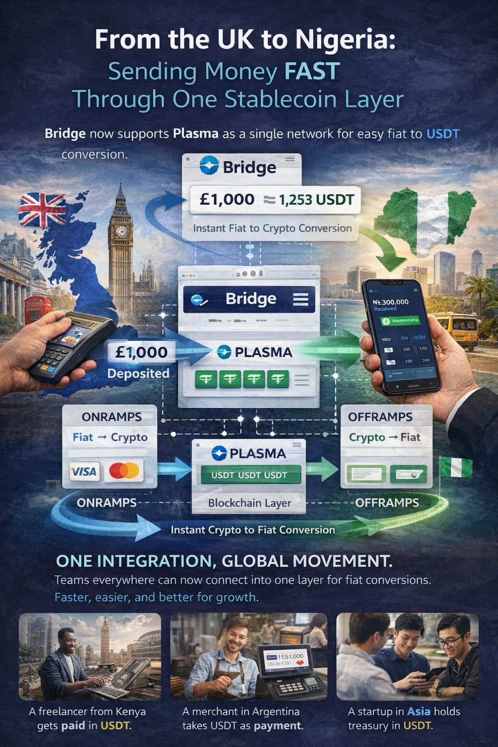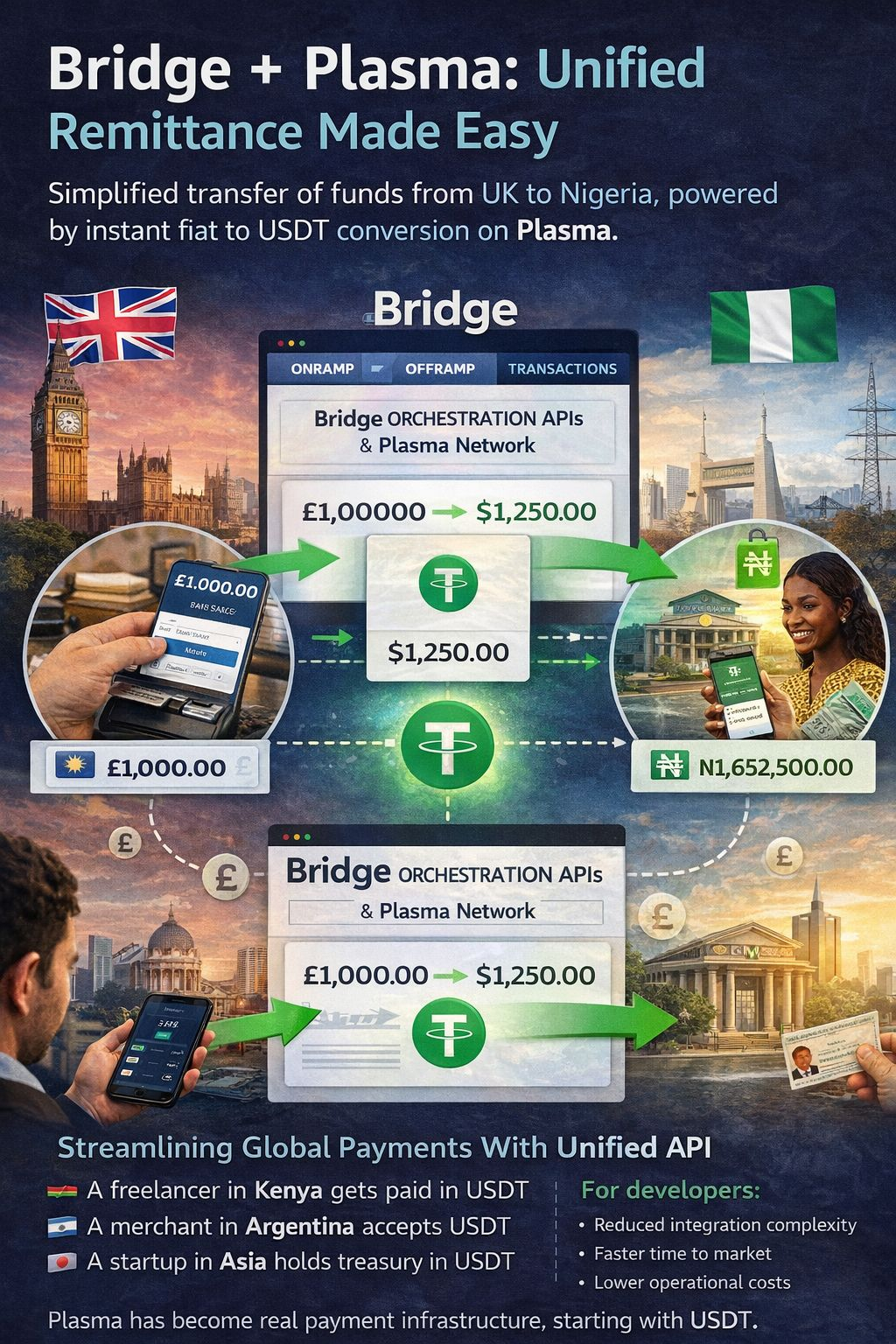 You’re building a remittance app for transfers from the UK to Nigeria. A user deposits £1,000 via their bank card. Through the Bridge API, that money converts into USDT on Plasma. The USDT moves instantly on-chain with minimal fees. On the receiving end, the recipient converts USDT back into local currency and receives it directly in their bank account—all handled through one orchestration layer.