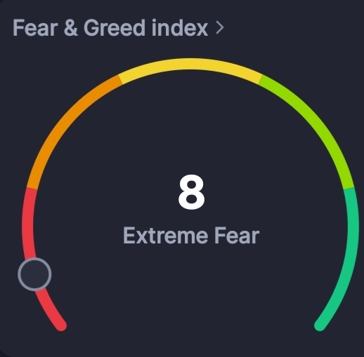 Fear & Greed Index: 8 – Extreme Fear (record lows around 5 recently, plunged from 11 yesterday)