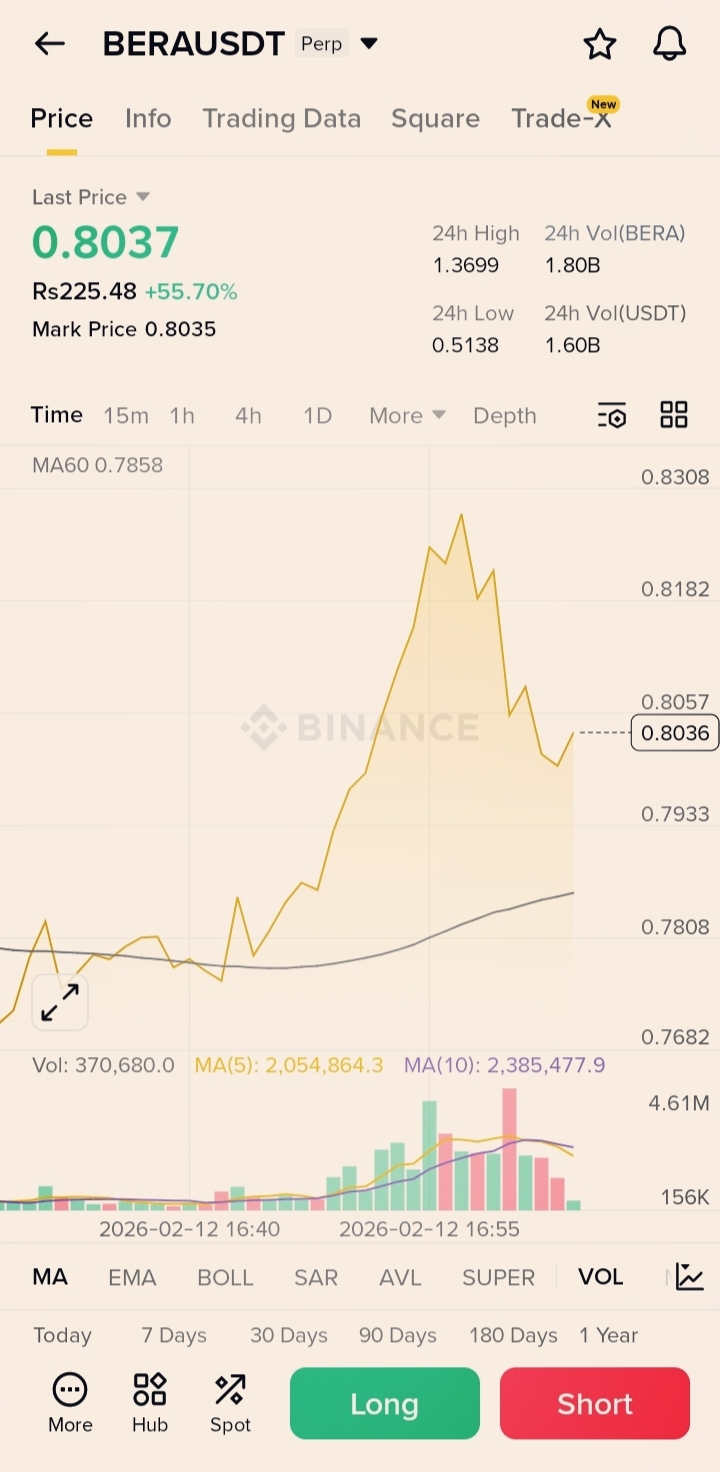 BERA remains highly volatile after an explosive move, holding above the MA60 with massive volume participation. Momentum is strong, but extended price action means pullbacks are possible. Manage risk carefully and avoid chasing green candles.
