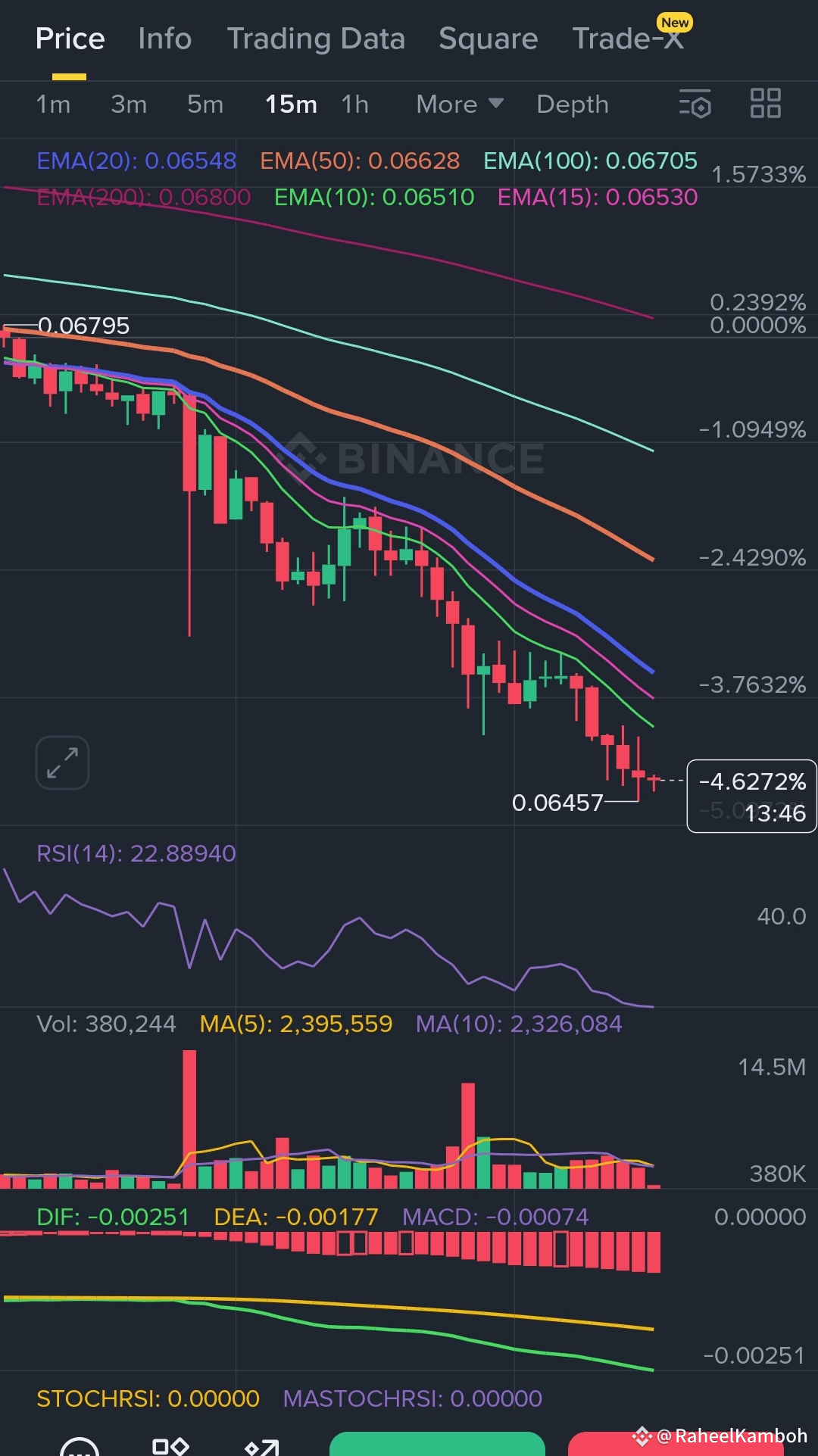 · 📉 Trend & EMAs: Price is trading BELOW all major Exponential Moving Averages (EMAs)! The EMA(20) at 0.06548 is acting as immediate resistance, with the higher EMAs (50, 100, 200) forming a solid wall above. This is a classic bearish structure. The path of least resistance is definitively DOWN. 🐻