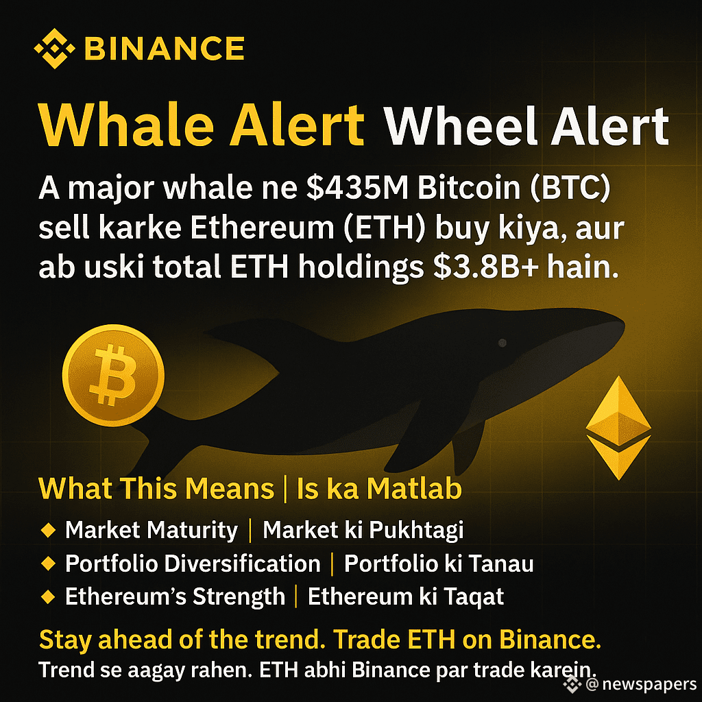 A major whale ne $435M Bitcoin (BTC) sell karke Ethereum ($ETH ) buy kiya, aur ab uski total ETH holdings $3.8B+ hain. 🐋