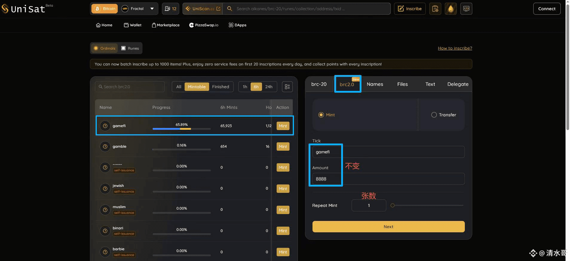 二、今晚差不多8点左右,万众期待的BRC2.0主网上线,以为可以大干一声,结果下来,好像静悄悄的,只出现了一个BRC2.0的代币Gamefi,大家高Gas在抢筹码(图二),目前进度65%,按平均10的Gas算,一张差不多要2.2美元。