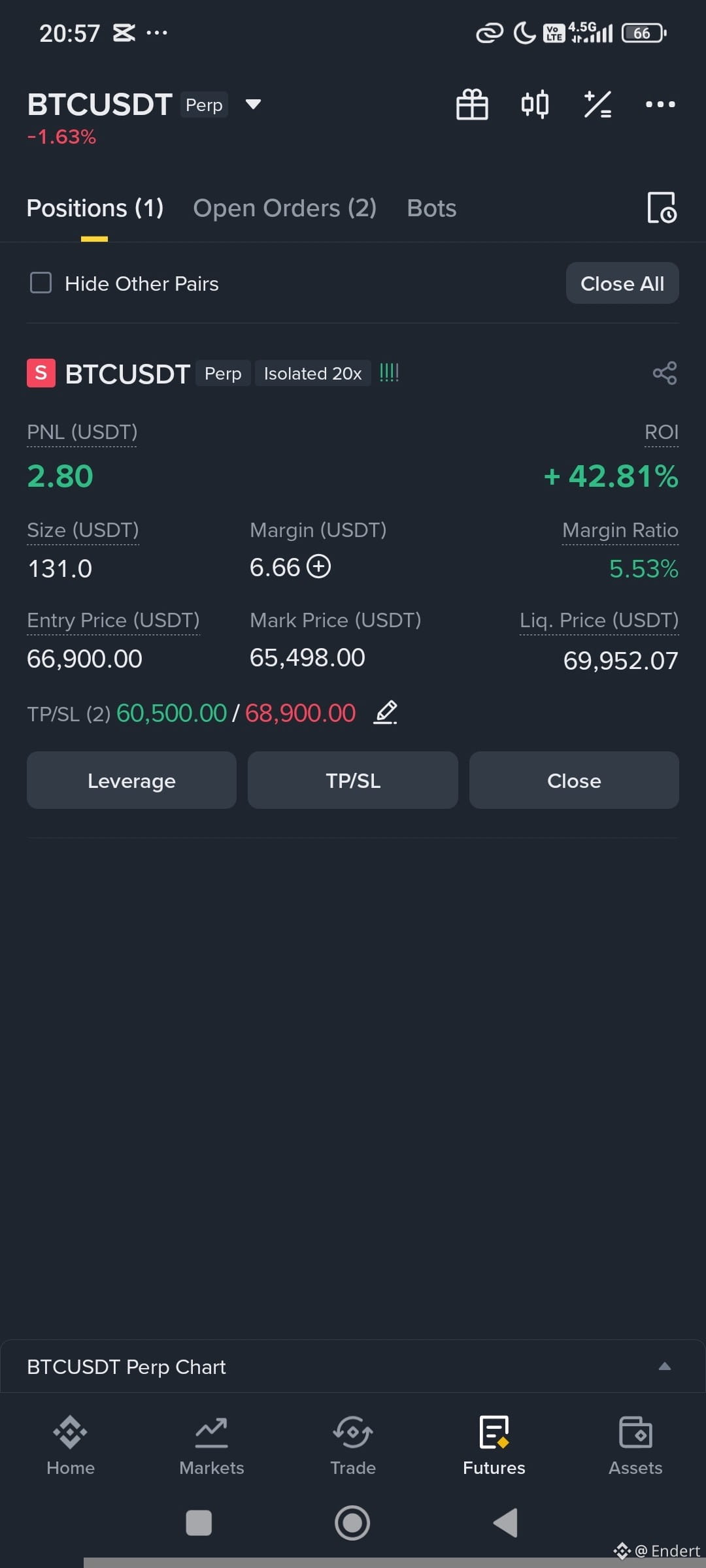 Within hours, the "Bearish Flag" played out, and BTC dropped to the $65,000 zone. Our position reached a peak of +42% ROI.
