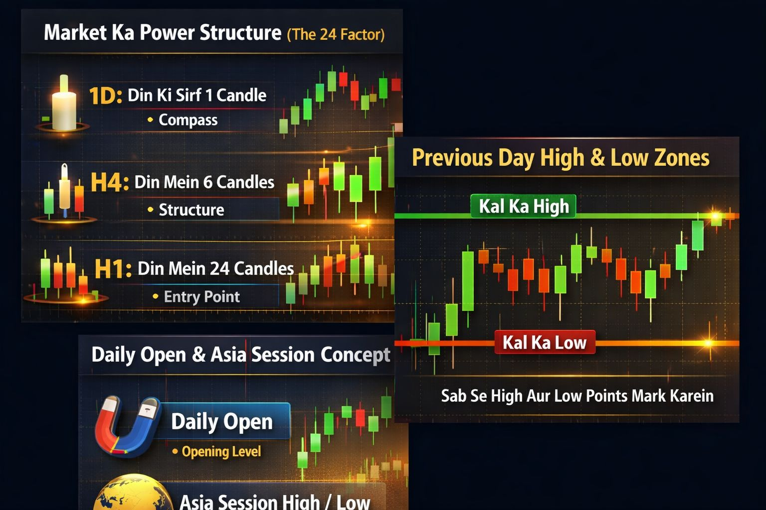 1. Daily Open: Har roz market jis point se shuru hoti hai, wo aik "Magnet" hai. Price is ke upar ho toh trend mazboot, niche ho toh kamzor.