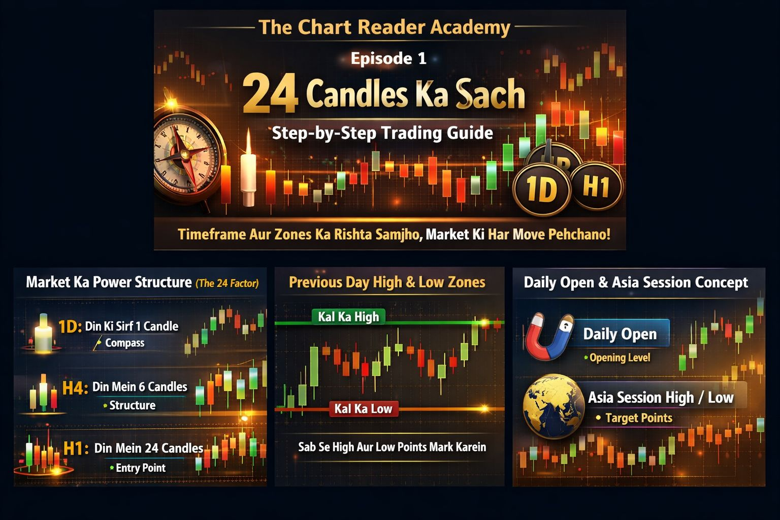 • 1 Day (1D): Din ki sirf 1 Candle banti hai. Ye aap ka "Compass" hai jo rasta dikhata hai.