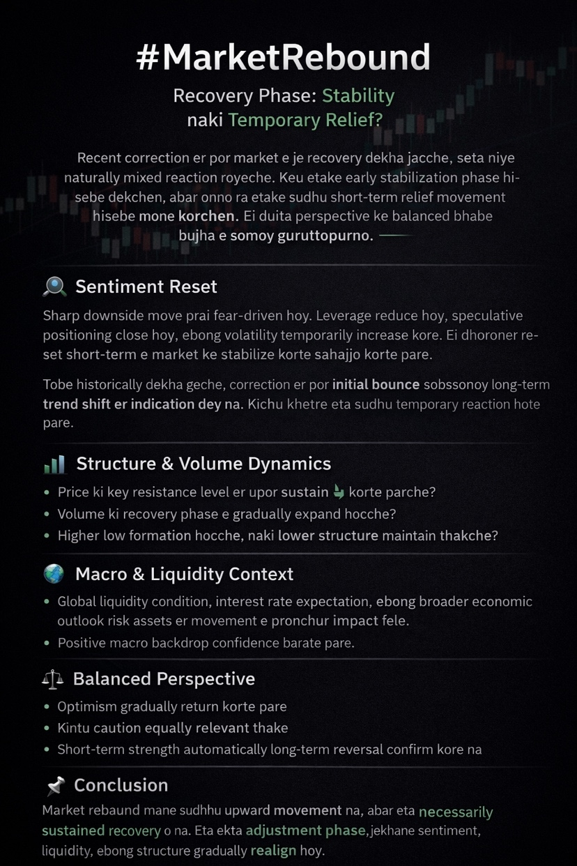 #MarketRebound After the recent correction, the market has shown some recovery, prompting mixed reactions. Some view this as an early stabilization phase, while others see it as a short-term relief movement. Understanding both perspectives is important to maintain a balanced view.