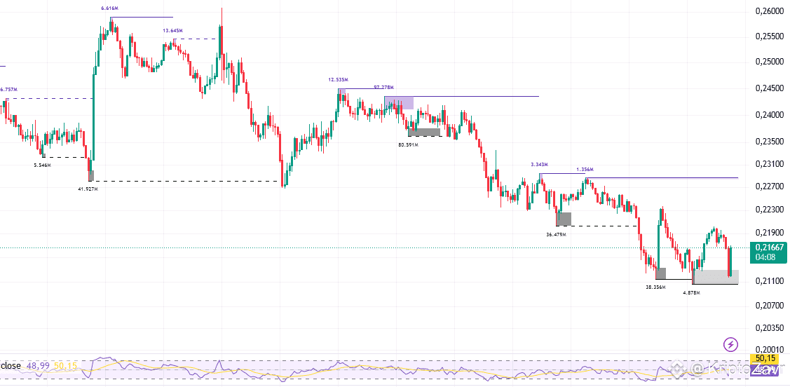 На падении: Падение цены с $0,22 до $0,21 сопровождалось значительным всплеском объёмов, что говорит о сильном давлении продавцов и массовой ликвидации позиций.
