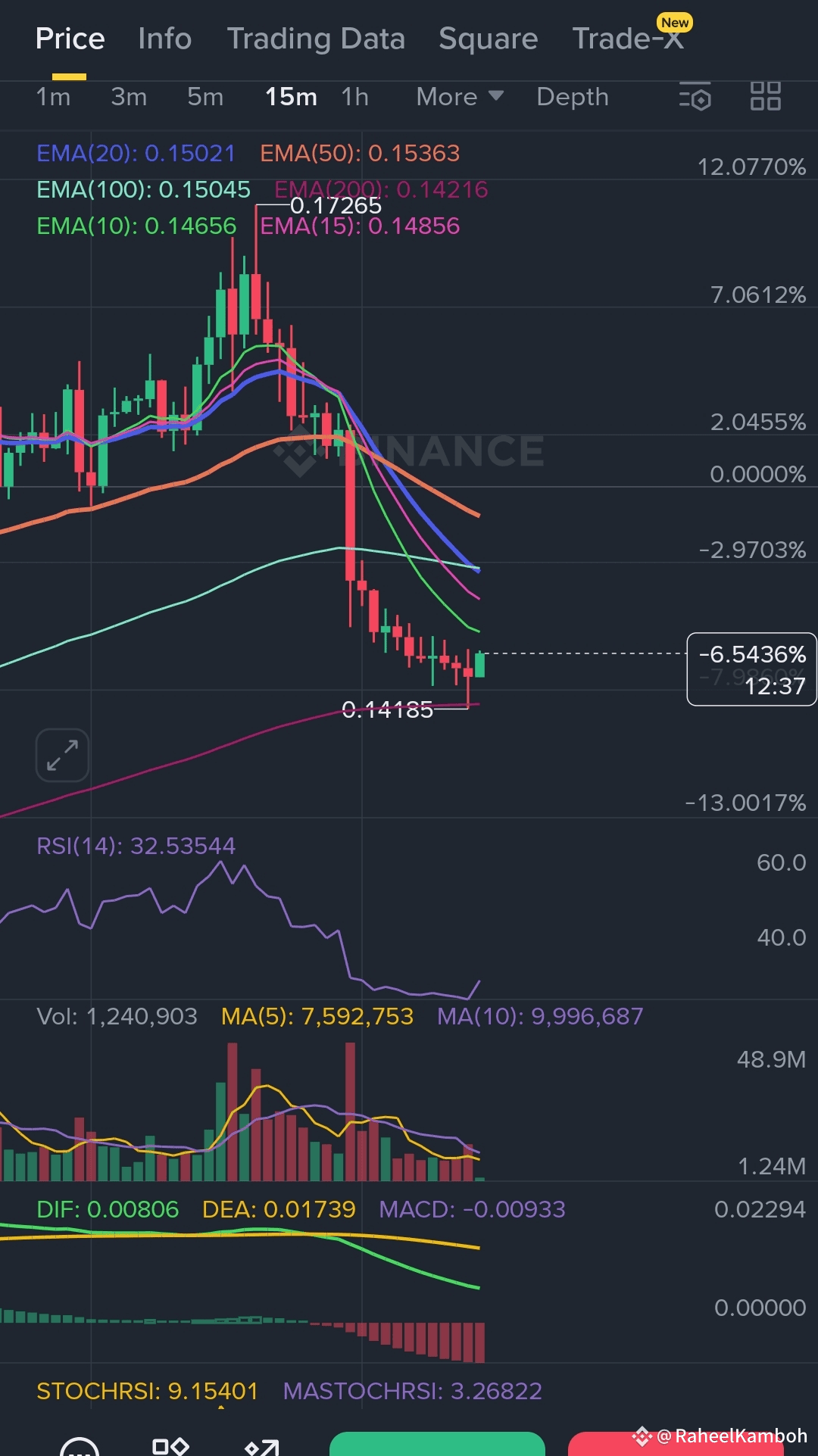 · 🎯 PRICE ACTION & PATTERNS: The price is attempting to push higher but is facing clear rejection near the $0.145 - $0.146 zone. Crucially, it's struggling to break and hold above key EMAs like the EMA(20) at 0.15021. This could be forming a potential BULL TRAP or a Double Top pattern on the lower timeframes. The last leg up looks exhausted.