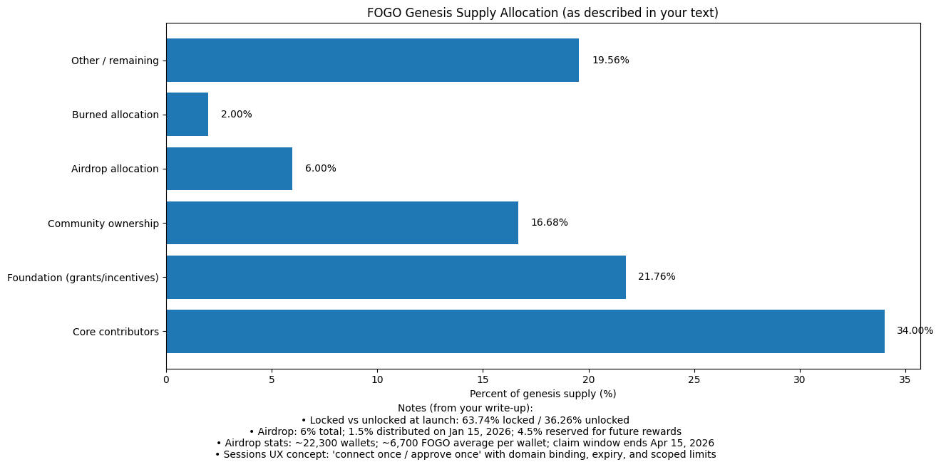 If you want a few hard data anchors to hold onto as you evaluate whether this direction is real: Fogo’s docs define Sessions as account abstraction plus paymasters, with explicit user protections like domain binding, scoped limits, and expiry. The official Sessions post (October 13, 2025) lays out upcoming improvements around clarity, transfers inside a session, calmer expiry handling, and permission guardrails.The Jan 12, 2026 tokenomics post says 63.74% was locked when things launched, with allocations like 34% for core contributors and 21.76% for the foundation. It also says 6% was set aside for an airdrop, and 1.5% was sent out on Jan 15. The Jan 15, 2026 airdrop post adds that about 22,300 wallets received it, the average was around 6,700 per wallet, and the claim window ends on Apr 15, 2026.