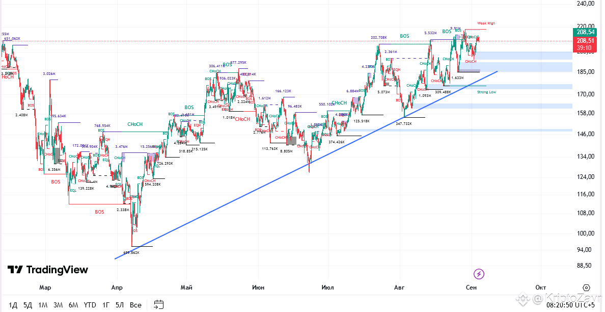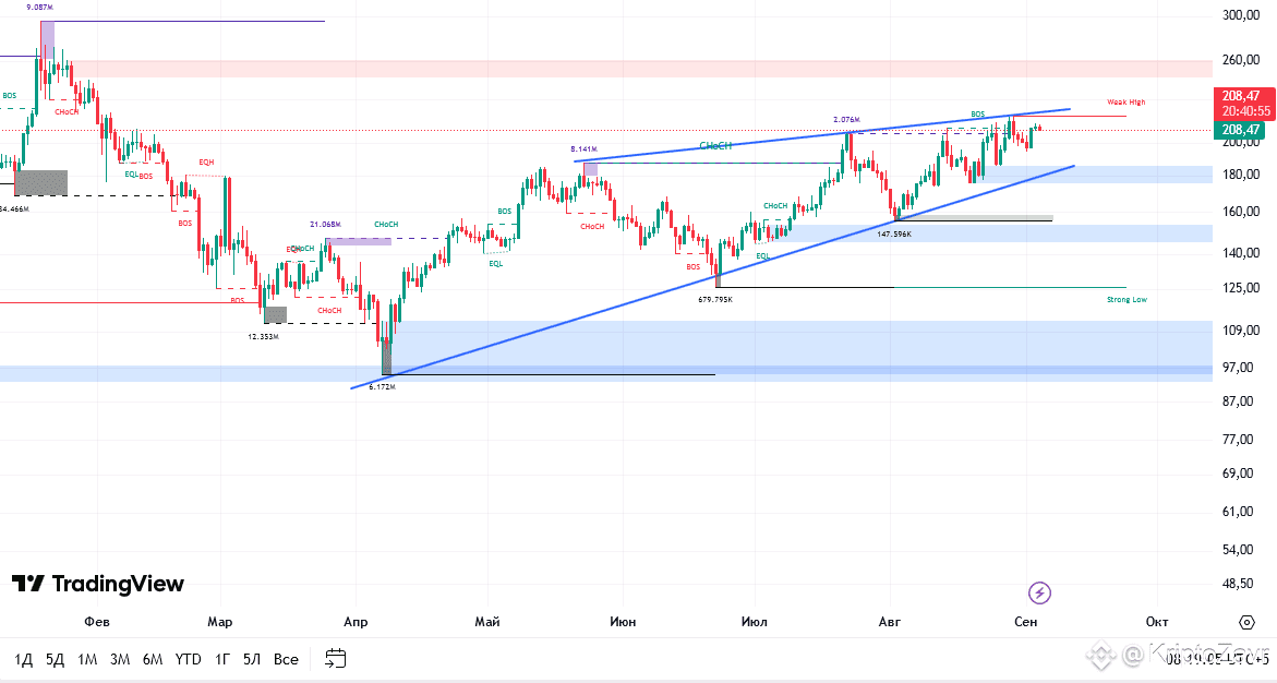 Технический анализ показывает, что цена SOL удерживается выше ключевой восходящей линии поддержки в диапазоне $190-200. Это создаёт основу для дальнейшего роста с прогнозируемыми целями в $225-291 в ближайшие месяцы.