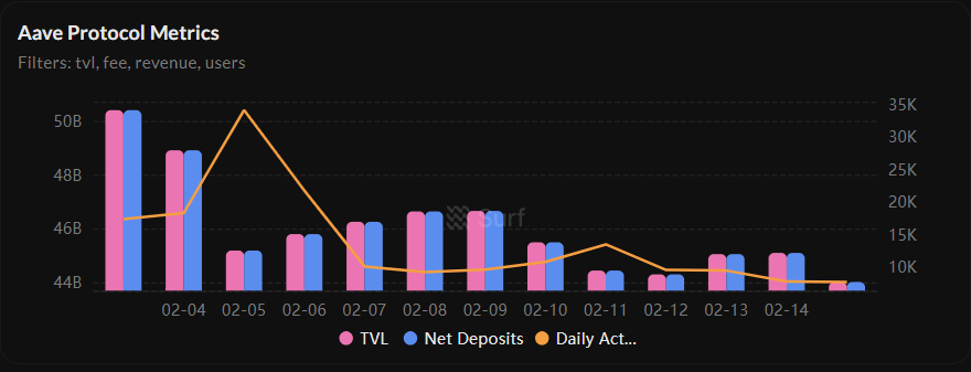 The TVL decline from $50.4B to $44.0B over 12 days reflects broader market conditions rather than protocol-specific issues. $AAVE continues to command significant market share in decentralized lending.