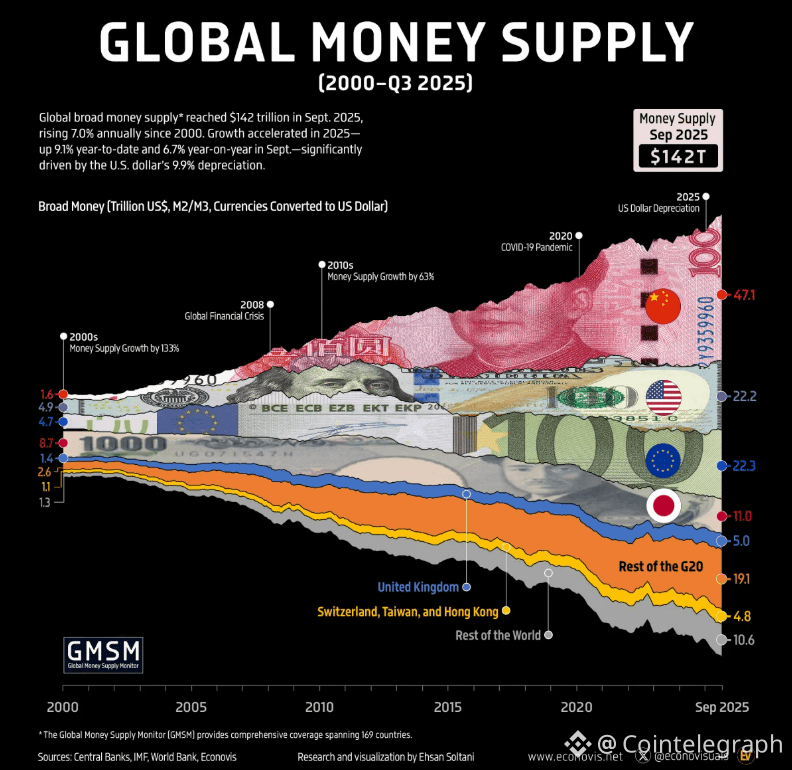 Data from Econovis found that global broad money climbed from $26 trillion in 2000 to an estimated $142 trillion in 2025.