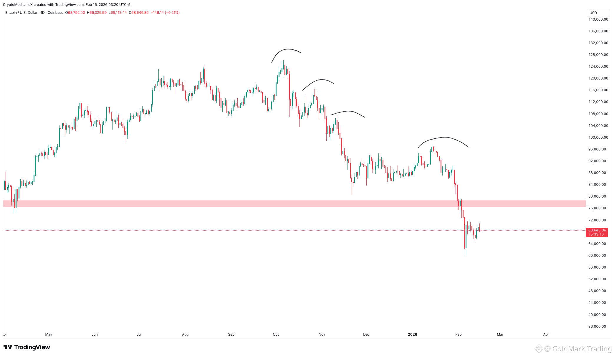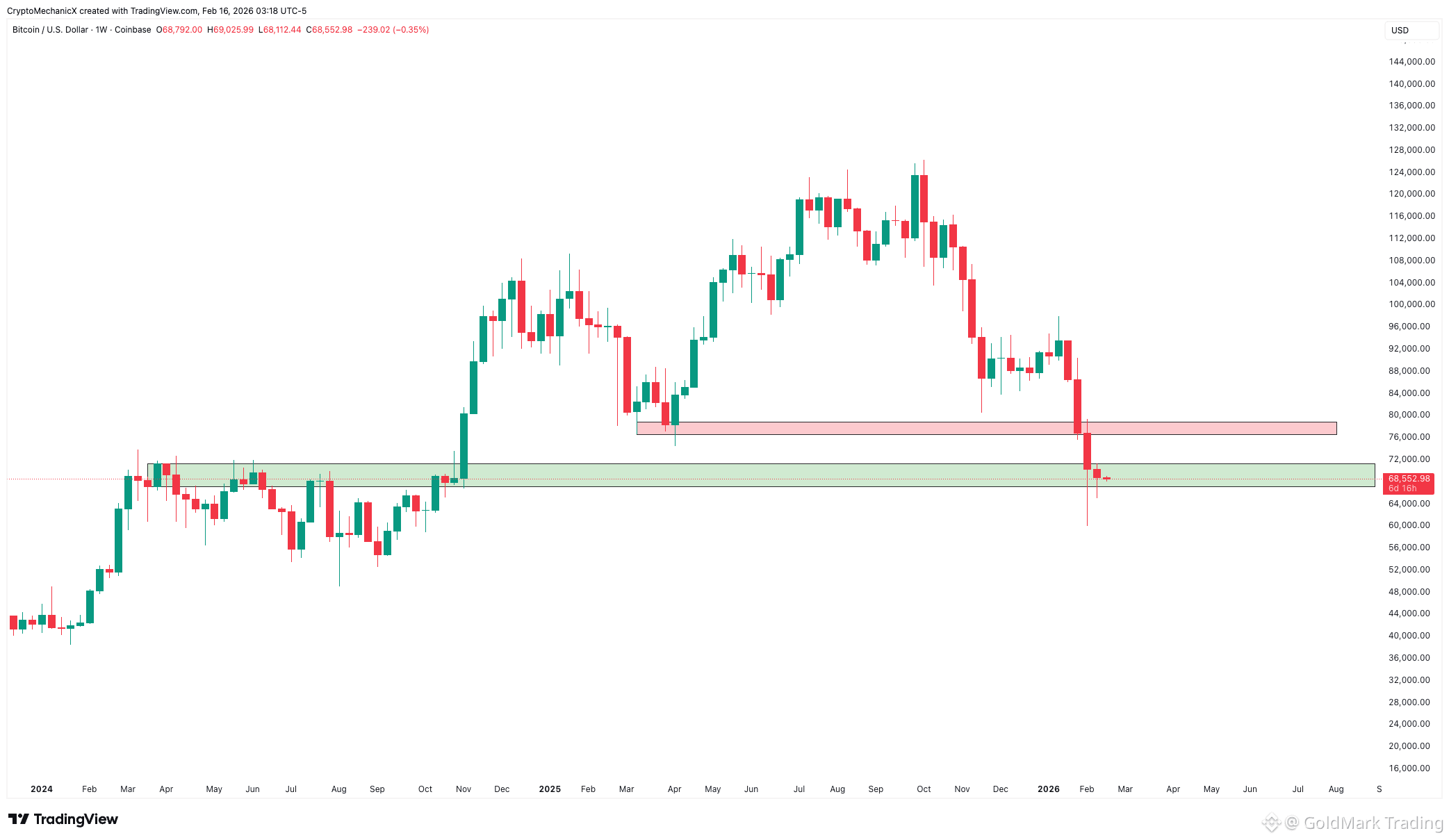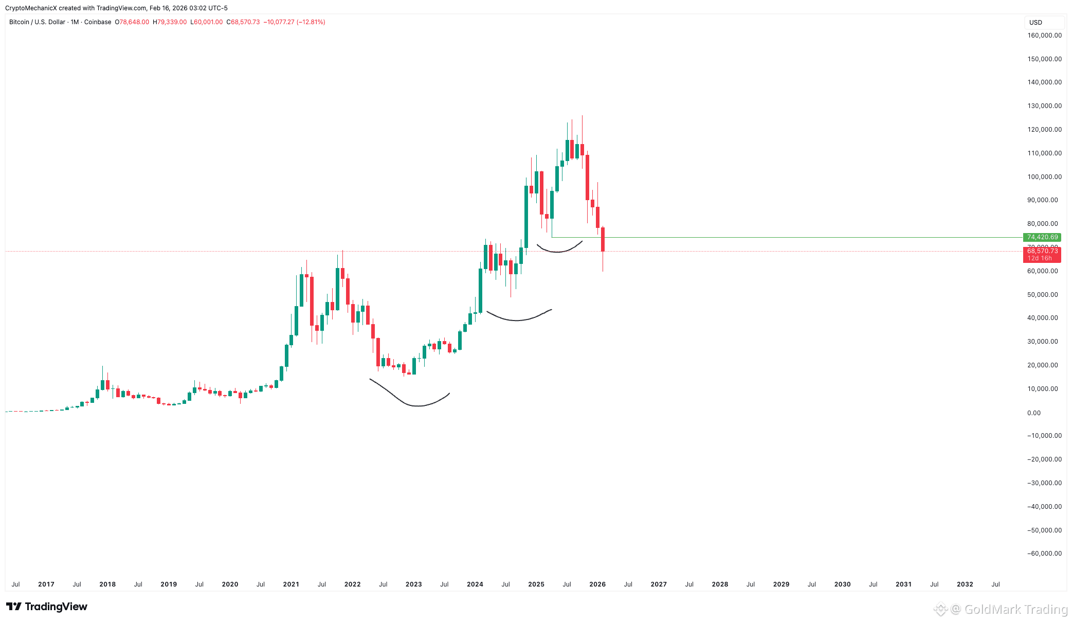 The monthly chart has been in an uptrend since the $16K bottom. The last higher low was formed around $74K, and the price is currently trading below it. A monthly close below $74K would break the bullish structure on the monthly timeframe.