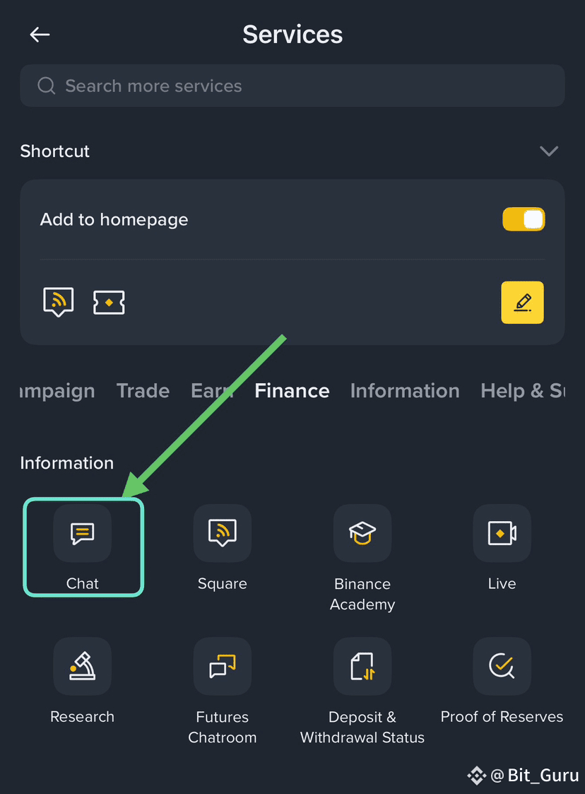 Step 1: Go to Services in your Binance app, then select Chat under the Information section.