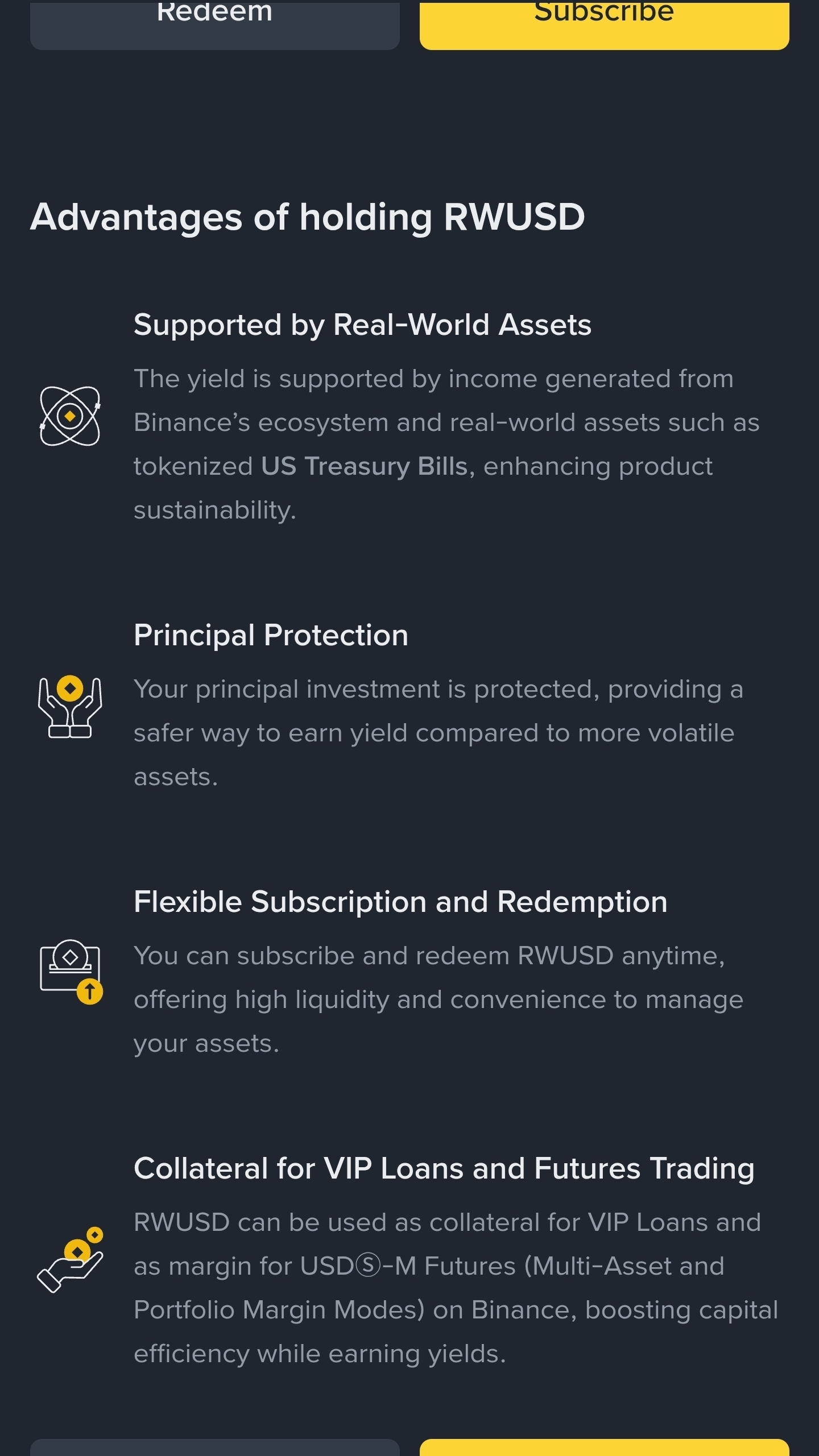 RWUSD is a tokenized representation of real world assets. When you subscribe, you are essentially converting your USDT into a product backed by secure, income generating assets specifically US Treasury Bills and the Binance ecosystem.