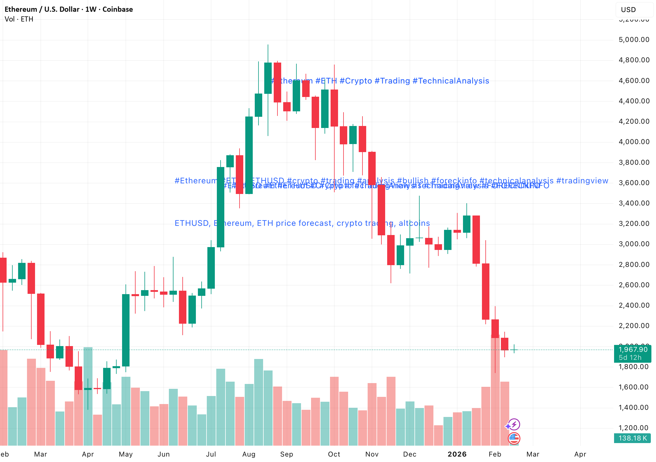 ETH/USD لا يزال محصورًا داخل قناة هابطة متوسطة المدى. بعد أن فشل في الاختراق فوق 3,353، انعكس السعر بشكل حاد وانخفض إلى 1,746، مما يشير إلى أدنى مستويات أكتوبر 2023. منذ ذلك الحين، استقر Ethereum ضمن نطاق توطيد ضيق بين 2,187.50 و 1,875.00 (Murrey [3/8]–[2/8])، مما قد يشكل علم استمرار هابط.