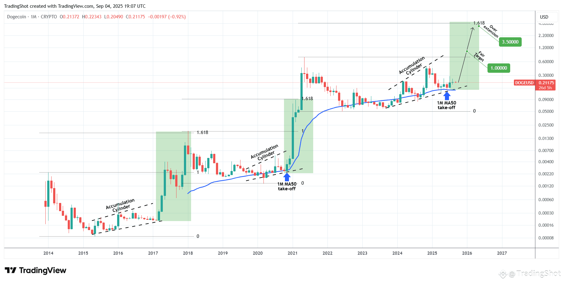 This fits the pre parabolic rally pattern of the Accumulation Cylinder that both previous Cycles had. As you can see, it is that exact pattern (Accumulation Cylinder) that historically makes Doge's transition from its Bear Cycle bottom to the Bull Cycle. Once the 1M MA50 is established as the Support, the Accumulation Cylinder gives way to a Parabolic Rally take-off.