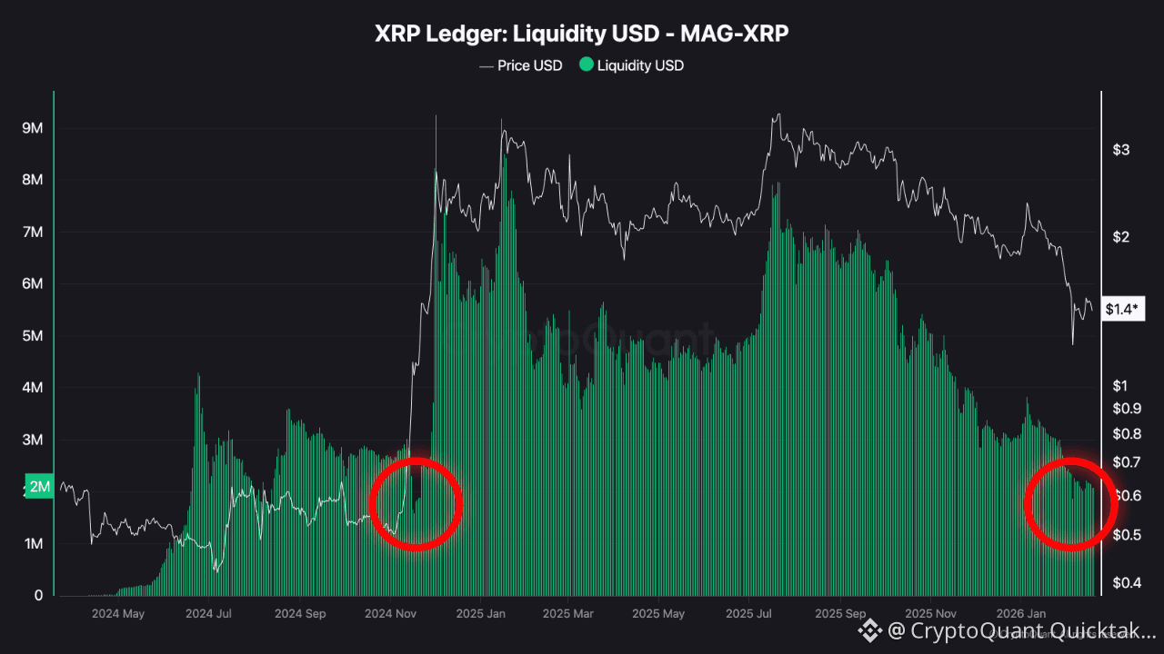 Liquidity XRP reflects token-side availability. Before the breakout, XRP liquidity compressed noticeably, indicating reduced active supply. That compression phase aligned with the start of the strong upward move. Currently, XRP liquidity is trending lower again, resembling earlier pre-expansion conditions.