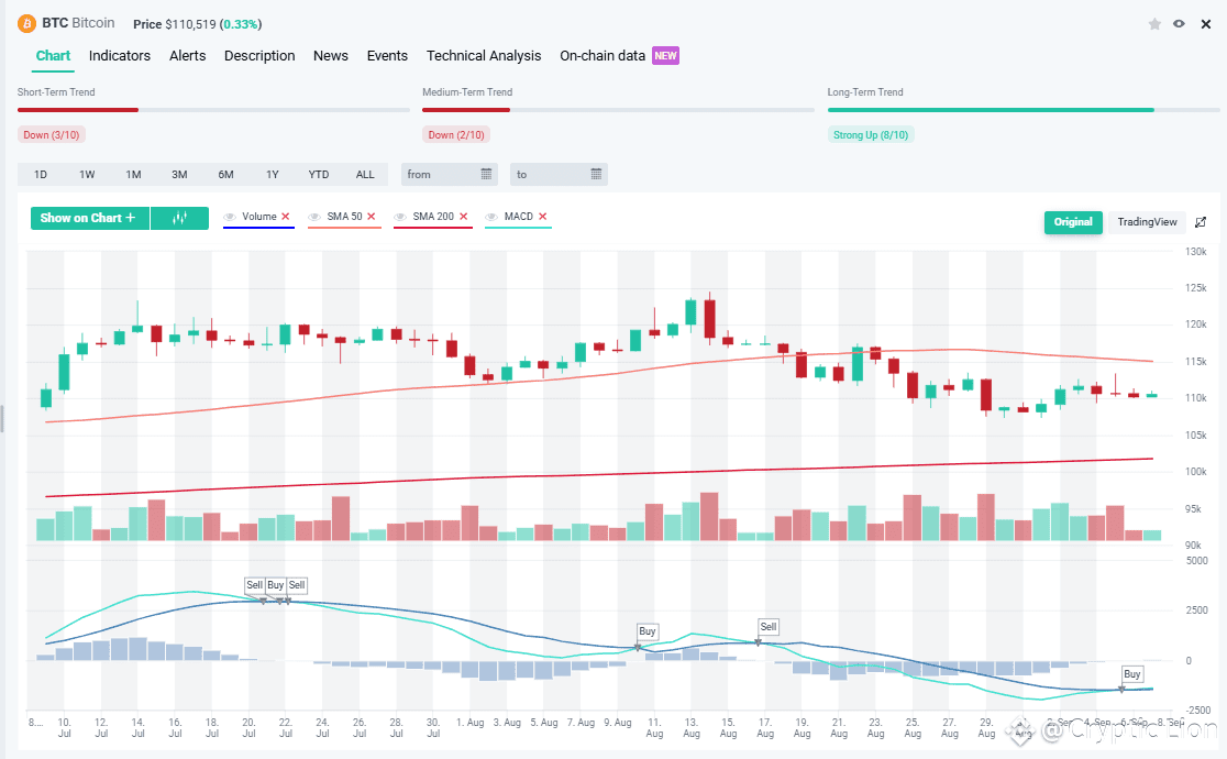 The MACD (Moving Average Convergence Divergence) has shown alternating buy and sell signals over the past month, which highlights indecision and choppy market conditions. Currently, a fresh buy signal has appeared, which may indicate that BTC is attempting to stabilize after the recent dip. However, the histogram remains relatively weak, so momentum may take time to rebuild before a significant breakout can occur.