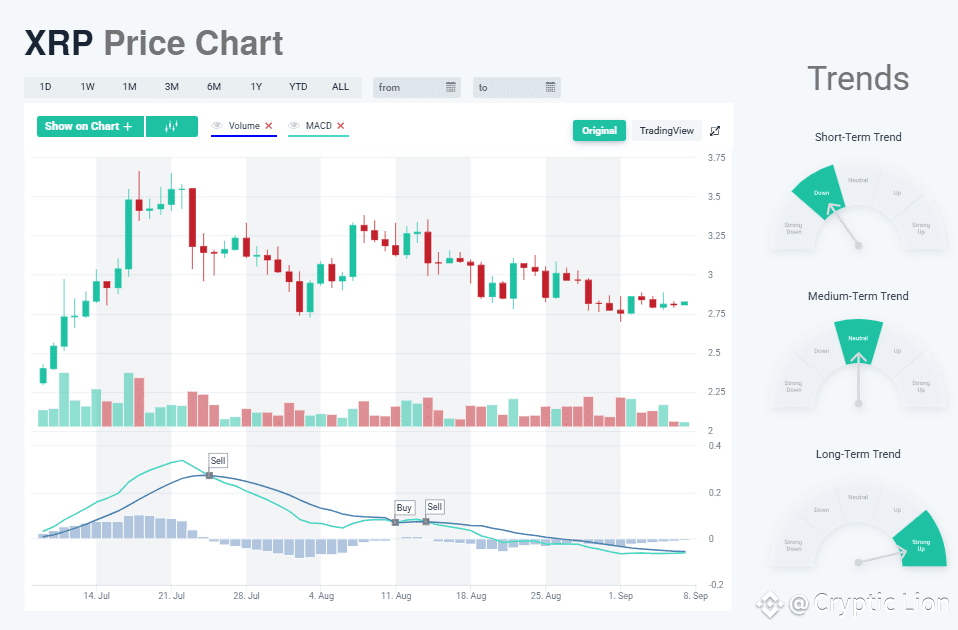 The one-day XRP chart is flashing red danger signals, with the short-term trend pointing down. After failing to hold strong above $3.00, XRP has slipped into a bearish channel, and buyers are struggling to regain momentum. Every attempt to bounce has been quickly sold off, leaving bulls gasping for air. 😬