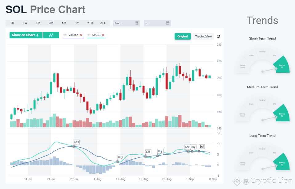 Solana (SOL) is stealing the spotlight with its one-day chart flashing green across the board. The short-term trend is marked as “Strong Up”, showing that buyers are flooding back in and refusing to let go of momentum. After holding firm above the $200 support level, SOL looks primed for its next big breakout. 📈