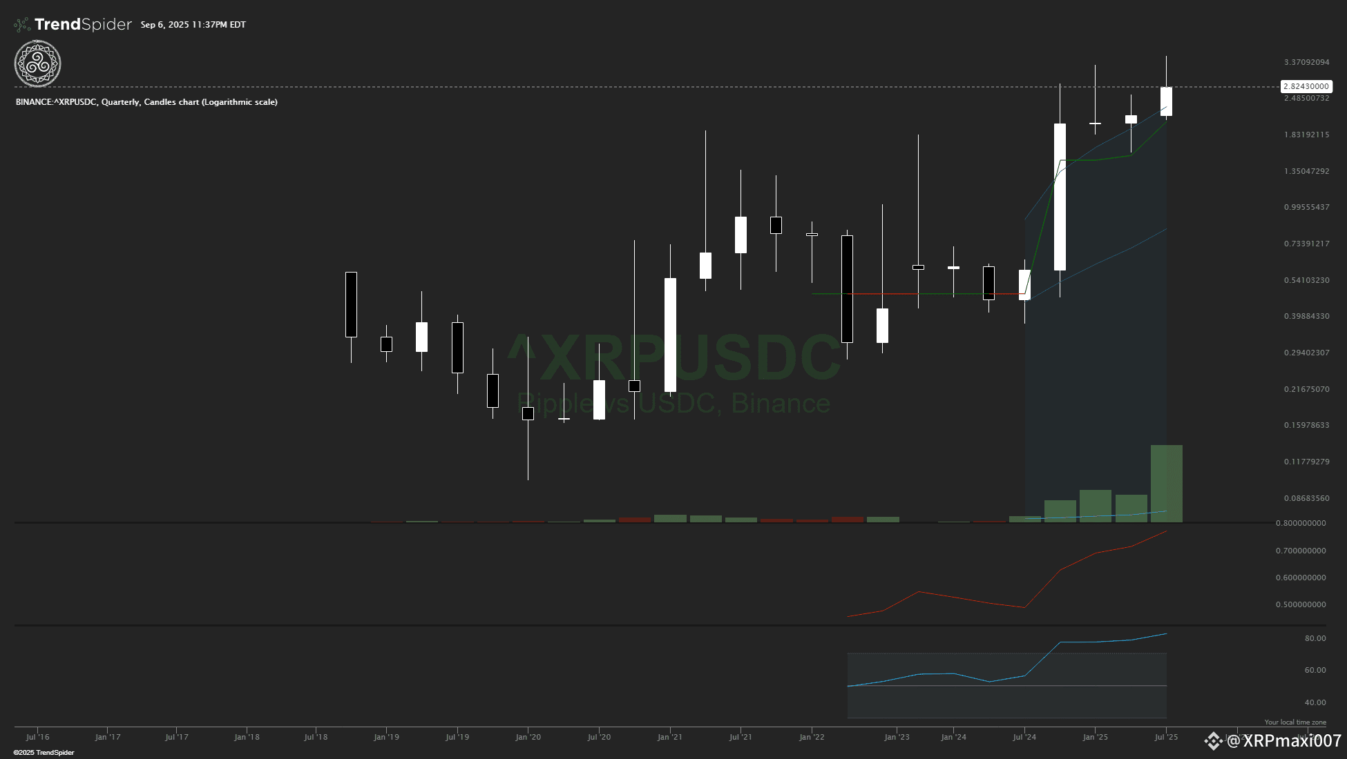 The quarterly chart for XRP confirms your observation - we're seeing a classic Bollinger Band breakout on this long timeframe with RSI at 82, indicating extremely strong momentum. The quarterly candle closed significantly above the upper band, pulled back to test it, and is now pushing higher again. This is exactly the type of pattern that preceded major multi-year bull markets in other assets.