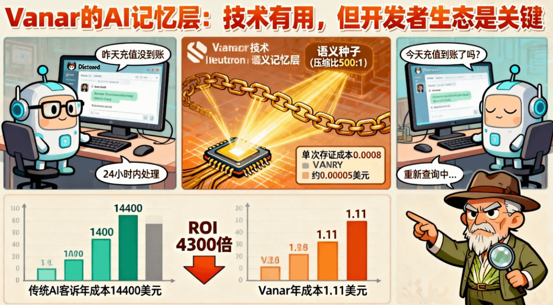 这技术有用吗?太有用了。我朋友那个电商项目,每个月付OpenAI 1200美元,40%是重复处理已解决过的客诉。用Vanar的话,年成本1.11美元,省下的是每月480美元浪费。ROI 4300倍。