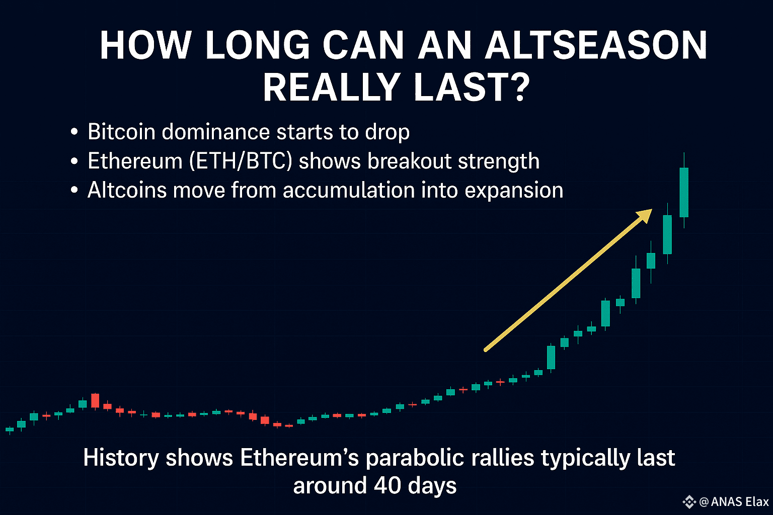 History shows Ethereum’s parabolic rallies during altseasons usually last around 40 days, but the broader expansion of altcoins can continue for over 500 days.