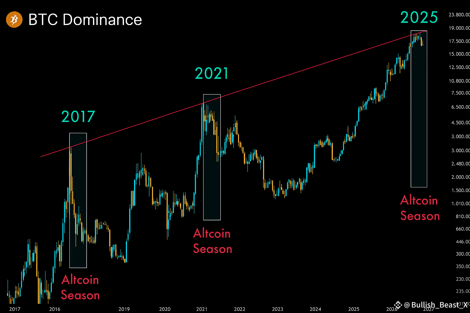 The crypto market is on the brink of a historic shift. Bitcoin ($BTC) dominance is showing clear signs of decline — a pattern that has always preceded explosive altcoin rallies. If history repeats, 2025 could deliver the most powerful Altcoin Season we’ve ever seen.