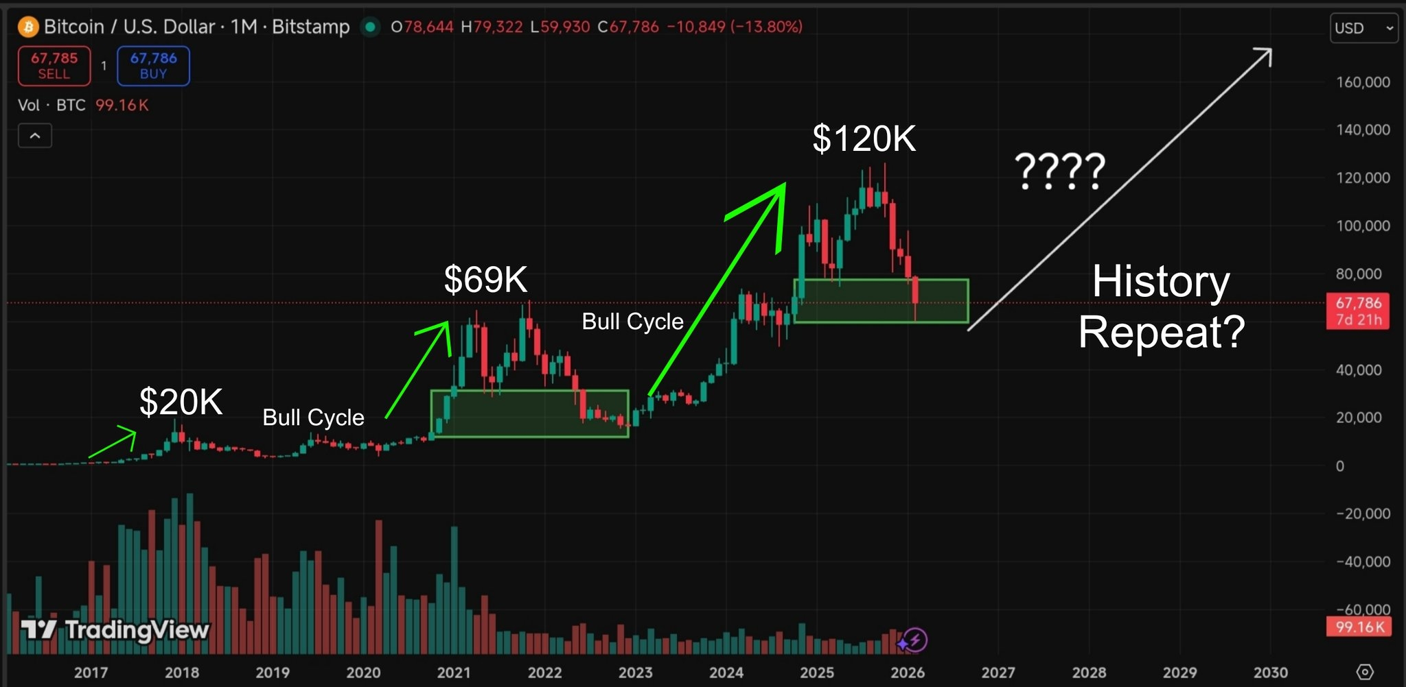 Now, in early 2026, Bitcoin trades around $67,000–$68,000 after a notable -13.8% monthly drop, sitting in what many view as a consolidation or correction phase post-peak