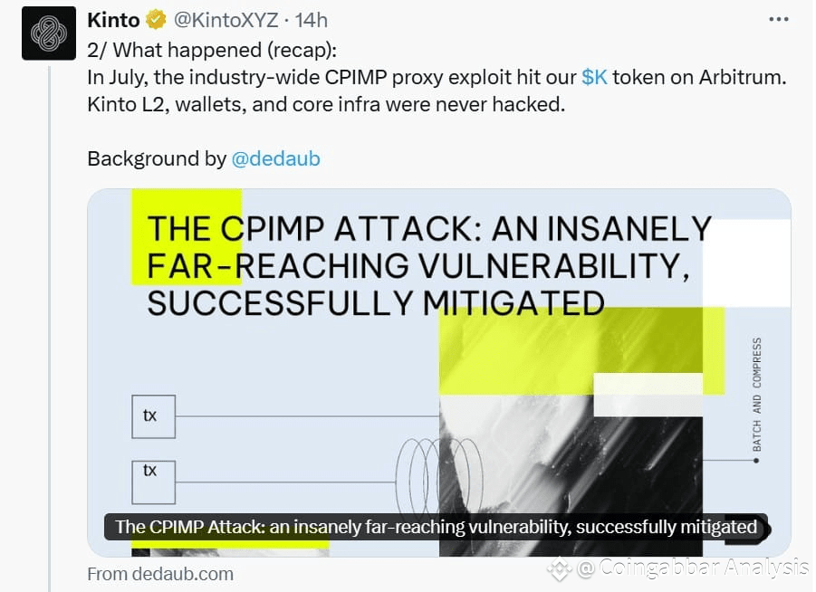 In early July a vulnerability in the token system allowed an attacker to mint fake tokens and drain value from Morpho lending pools. About 577 ETH roughly $1.6 million — was taken during the incident. The exploit came from a proxy-level weakness that has affected several projects using similar contract patterns. This shock hit Kinto’s token and its finances hard.