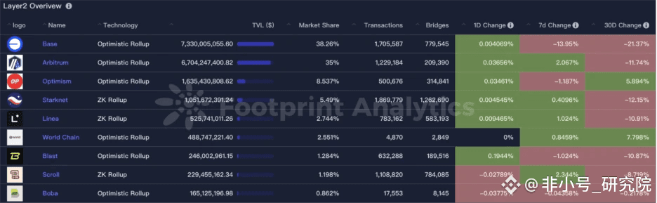 Base和 Arbitrum 分别以38.26%和 35%的市场份额占据前排,Base链过去一周市场份额略有下降,Arbitrum 有所上升。