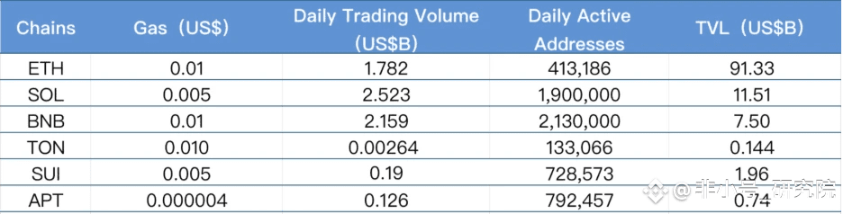 主要从日交易量、日活跃地址、交易费用分析目前主要 Layer 1 含 ETH、SOL、BNB、TON、SUI 以及 APTOS 的相关数据。