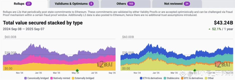 据 L 2 Beat 数据显示,以太坊 Layer 2 总 TVL 为432.4亿美元,本周较上周($429.8 亿)整体涨幅为 0.6%。