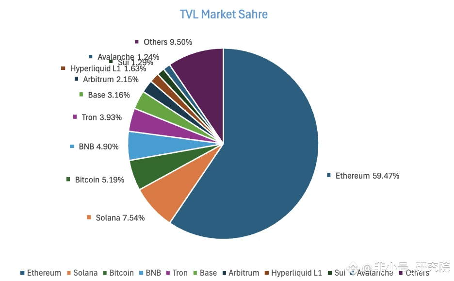 按公链进行划分,其中 TVL 最高的三条公链分别是 Ethereum 链,占比 59.47%;Solana 链,占比 7.54%;Bitcoin,占比 5.19%。