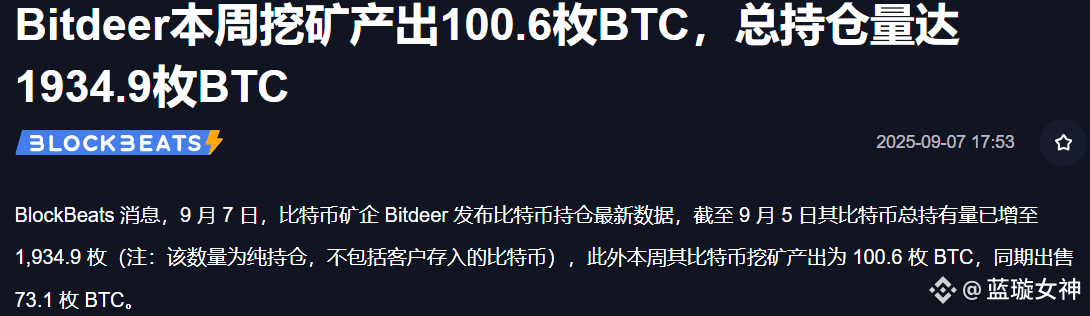 全球顶级矿企Bitdeer最新数据披露:本周挖矿产出高达100.6枚BTC,总持有量猛增至1934.9枚,距离2000枚大关仅一步之遥!