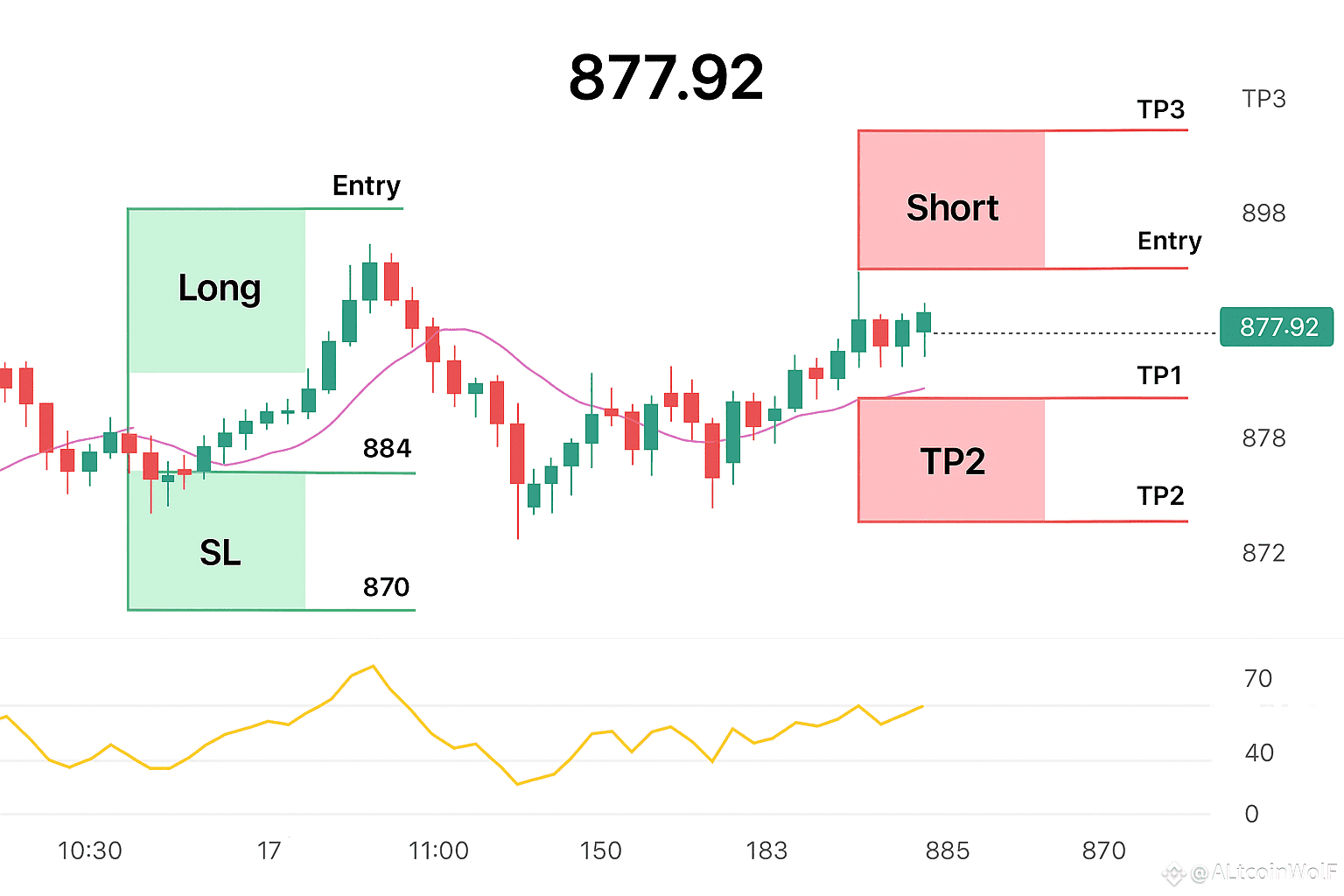 📈 Logic: If BNB holds above MA cluster (875–877) and RSI stays >60, bullish momentum can push towards 884–890 resistance.