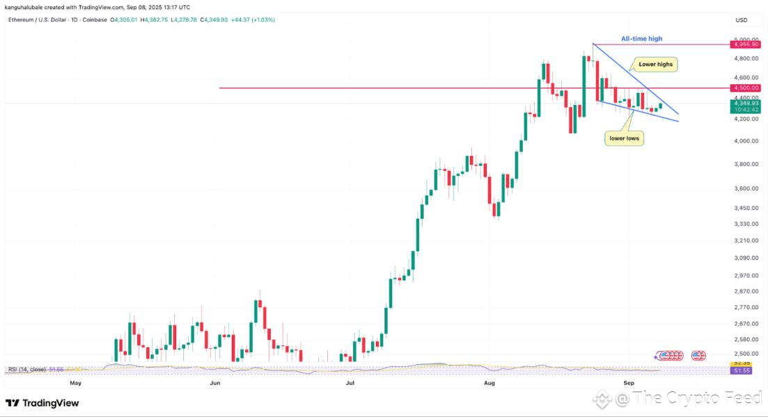 Bearish Descending Triangle Pattern: Ether's price has formed a descending triangle pattern on its daily chart. This is a bearish technical pattern characterized by a series of lower highs and a flat support line. According to this pattern, if the price falls below the support level of $4,200, it could trigger a continued downtrend. The measured target for this drop is around $3,550, which is an 18% decrease from current price levels.