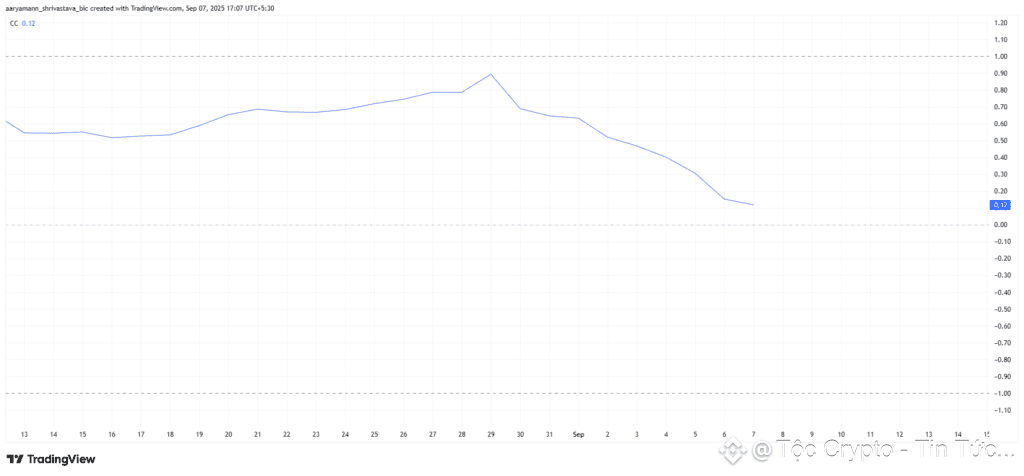 Hiện nay, tương quan giữa Pi Coin và Bitcoin chỉ còn ở mức 0,12, một con số không khả quan cho thấy Pi Coin đang hoạt động gần như độc lập với sự biến động của Bitcoin – đồng tiền điện tử lớn nhất thế giới. Điều này tạo ra một sự phân kỳ rõ rệt giữa Pi Coin và Bitcoin, khiến cho đồng tiền này không thể tận dụng sức mạnh từ xu hướng chung của thị trường. Ngược lại, Pi Coin đang phải đối mặt với áp lực bán gia tăng và sự giảm sút niềm tin từ nhà đầu tư, dẫn đến tình hình giá ngày càng yếu đi.