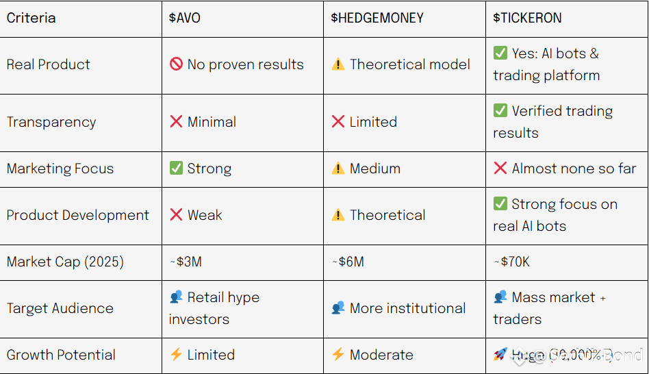 In this analysis, we compare three tokens in the AI-trading and algorithmic space — $AVO, $HEDGEMONEY, and $TICKERON — and explain why one of them may be the most undervalued token on the market right now.