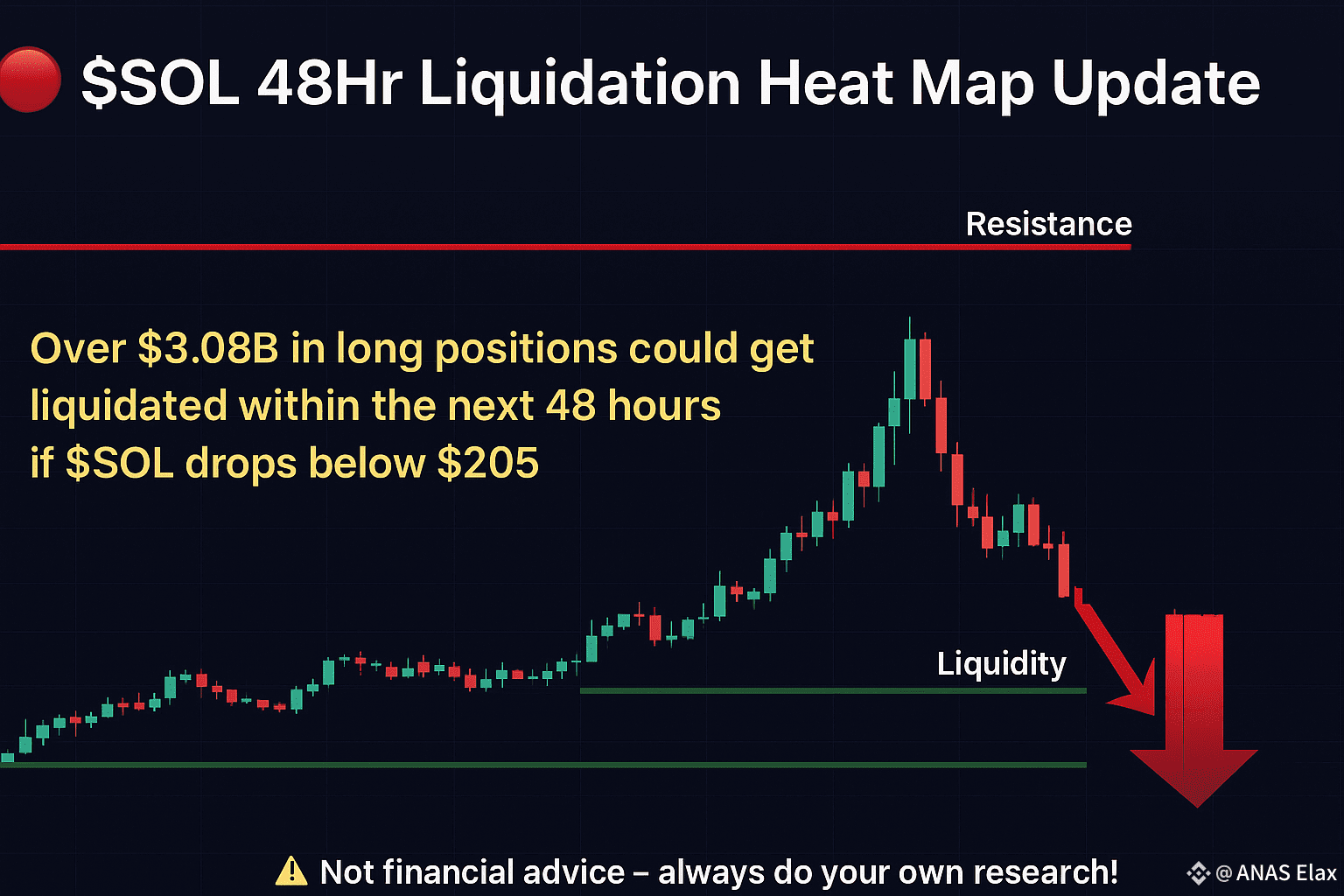 😱 More than $3.08B in long positions could face liquidation in the next 48 hours if $SOL drops under $205.