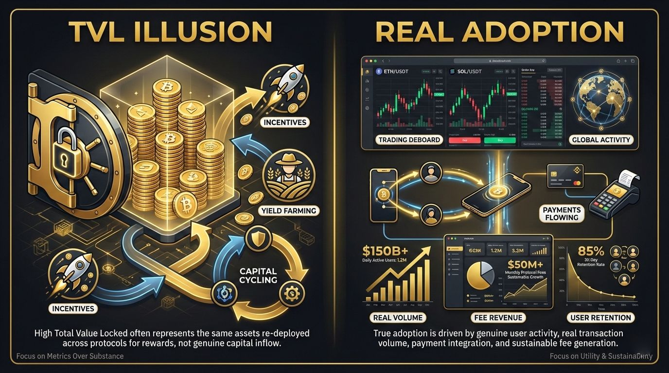 Locked value does not always represent real usage. It often represents incentives, leverage, and capital cycling within the same ecosystem.